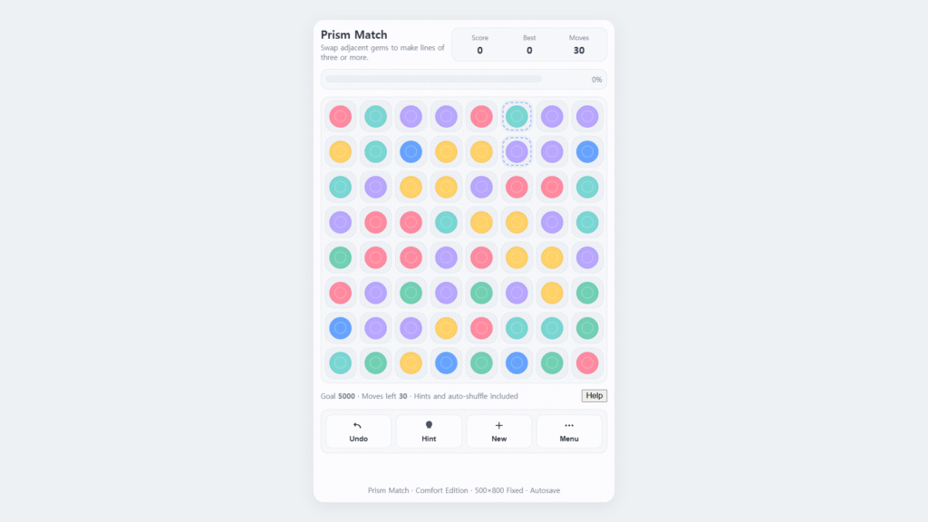 • A softer, low‑glare Match‑3 built for mobile in a fixed 500×800 frame.